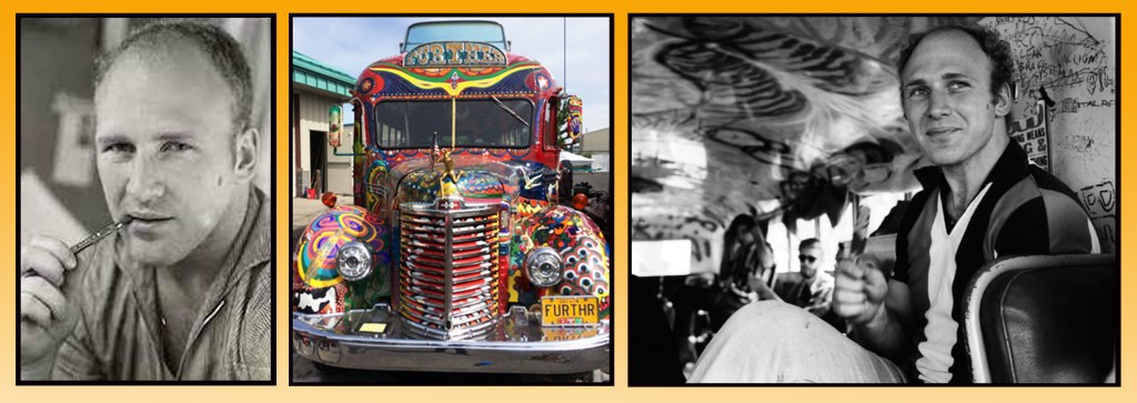 From left: author Ken Kesey, Merry Pranksters bus and Kesey inside it.