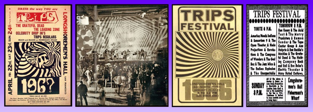 Early poster art for The Trips Festival and a photo of Quicksilver Messenger Service playing at it.