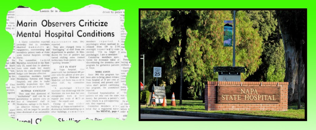 Darkness and pessimism were two realities that I was slowly descending into.  I had been incarcerated in Napa State Hospital from the middle of July until the first week of August when my father got me discharged because of a suicidal inmate who took against me.  All the time I was there and for many weeks after, I was in my own universe with practically no interest in or knowledge of what was going on out in the real world.  When I got back to my parents’ apartment, I didn’t read the Chronicle or watch the news.  I listened to pop music on the radio but that was the limit of my intake.