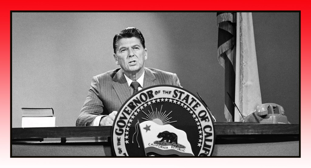 The new governor of California had become a darling of the extreme right wing of the Republican Party.  In 1964 Barry Goldwater ran for president on a pro-Vietnam War platform and who should be there to make a televised speech on his behalf but Reagan.  Goldwater lost big to incumbent Lyndon Baines Johnson but Reagan’s speech at the Republican convention put the faded movie star on the conveyer belt which ultimately took him to the governor’s mansion.