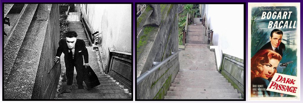 The neat trick that Dark Passage pulled off was that we never saw Bogart’s face until he wound up having plastic surgery.  With a big bandage covering his face, he staggered up the steps at Filbert Street to Bacall’s apartment on Telegraph Hill.  This was the scene that Coco had witnessed the filming of.  She told me she felt very sorry for Bogart who had to repeat the climb many times as they shot take after take.