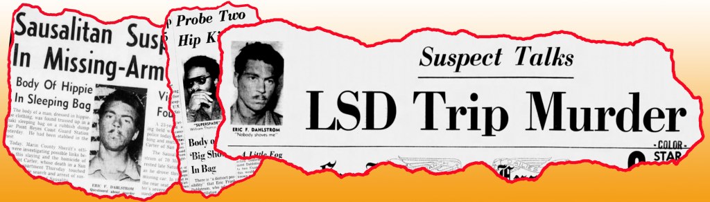 Eric Dahlstrom was not shy about telling the story of Carter’s murder to assembled reporters at San Francisco police HQ.  He said that he had killed Carter while under the influence of LSD and that he had considered dismembering the body.  According to Helix, a Seattle underground newspaper, Dahlstrom was undergoing an “Olympics-calibre bummer caused, he believed, by inferior-quality acid” which Carter had sold him.  Offended, he went to Carter’s to discuss it.  During the discussion, Dahlstrom said, Carter shoved him.  “I got shoved,” he told reporters.  “Don’t nobody shove me.”  The Helix account continued: “Dahlstrom grabbed up a 12-inch kitchen knife and stabbed him rapidly 12 times, most of them fatally.  He undertook to dismember the body , but gave it up after neatly amputating the right arm above the elbow.  He wrapped the arm in blue suede and split with it, taking also a .38 pistol, $3,000 Carter had assembled to give to an acid wholesaler called Superspade.”