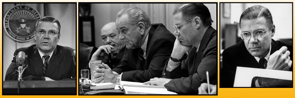 Three photos of President Johnson’s Secretary of Defense Robert McNamara. Pictured in the centre photo is Secretary of State Dean Rusk, Johnson and McNamara.