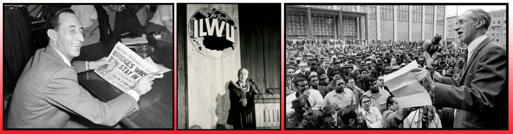 From left: the 1934 longshore strike, the ILWU logo, the longshoremen march up Market Street in 1939.