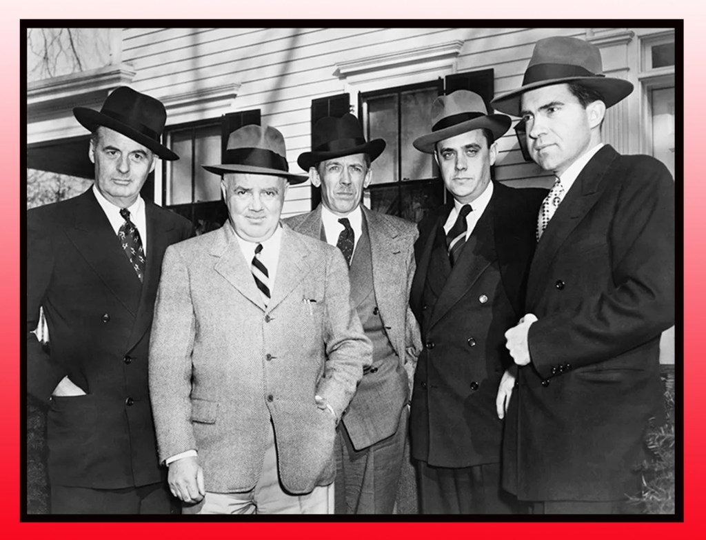 The House Un-American Activities Committee featuring a young Richard Nixon on the right and J. Parnell Thomas in the centre.