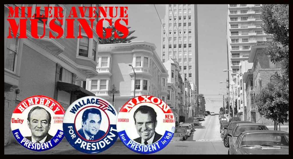 After leaving Jar I took a Greyhound bus back to the city. If I had a graphics job to complete I would do it at my parents place where I had a big drawing board in my bedroom. So the city was where I worked and Mill Valley was where I would go to hang out with my friends and get high. On my next Mill Valley excursion, having crashed at a friend’s house high up on Edgewood, I awoke to a sunny day and, splashing water on my face, walked down the road to Molino and took a left on Mirabelle. I continued onto Ethel past a few barking dogs until I came to the steps behind Brown’s Department Store where I descended to Miller Avenue. Suddenly I found myself downtown on a beautiful summer’s day. I wandered up past Mens’ Mayer’s and Meyer’s Bakery then crossed the street.
