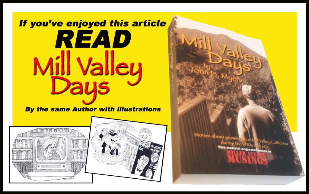 Another venue I spent a lot of time at was the Bus Depot. It was a train station when it opened in 1889, but by the time my family arrived in Mill Valley in 1952, it was the place the Greyhound buses to and from the city arrived and departed from. More importantly for me as a small child was the huge selection of comic books they displayed on their racks. I spent so much time at the Bus Depot that the ladies who worked there, Brun and Margo, got to know me and allowed me to read the comics when other kids were told to put them back.