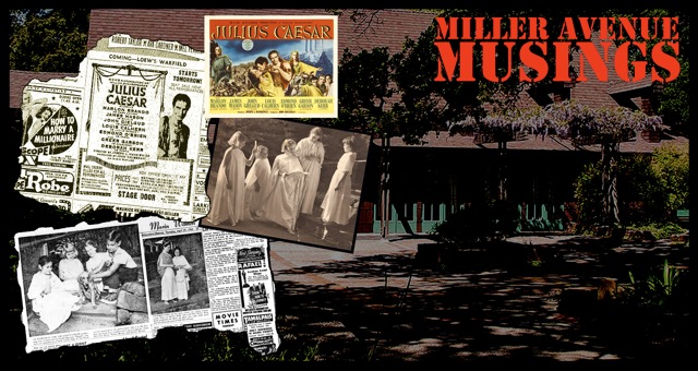 Because Nellie and Katie were older than Jimmy and I they were able to take trips into the city to see shows like Porgy And Bess or South Pacific at the Curran and Geary Theatres.  Both these theatres put on touring productions of Broadway shows.  On one such outing they went to see the MGM movie of Julius Caesar at the Stage Door.   Directed by Joseph Mankiewicz it featured a glittering combination of British and American actors.  Marlon Brando, James Mason and John Gielgud were just three of the big names in this film and Louis Calhearn played Caesar.