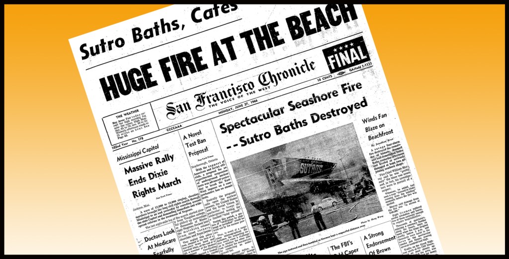 Sutro’s was sold to property developer Robert Frazer in 1964.  Frazer had plans to build luxury apartments on the cliffs.  Then on a Sunday late in June, 1966, Sutro’s burned to the ground.  Arson was immediately suspected by SF Fire Chief William Murray as many witnesses had seen a man dressed in khaki fleeing the building moments before the blaze was spotted.