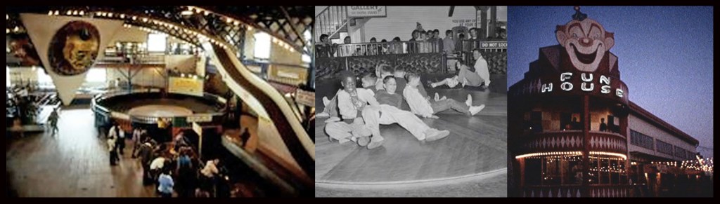 A huge wooden turntable stood motionless within a gated area.  A man opened the gate surrounding it and Jimmy, Danny and I, along with a huge crowd of other kids, scrambled for a place on its surface.  The walls of the fenced in area were well padded with foam cushions.  Once the gate was shut the turntable began to spin like a record player.  It started slowly and got faster and faster.  Since there was nothing for anyone to hang onto, every single child was eventually propelled off and into the cushioned wall.