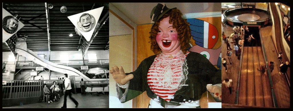One sound which seemed audible all over Playland was the laughter of this giant female puppet with a shock of red hair under a straw hat.  Laughin’ Sal was her name and she had a big gap between her front teeth and stood inside a large glass case near to the ticket booth with her arms out stretched.  Her laughter was non-stop as the top half of her body rocked back and forth.  The unnatural sound of her cackle seemed to set the tone of the place: bizarre.  At age 7, if I had ever found myself alone at Playland it would have scared the hell out of me.