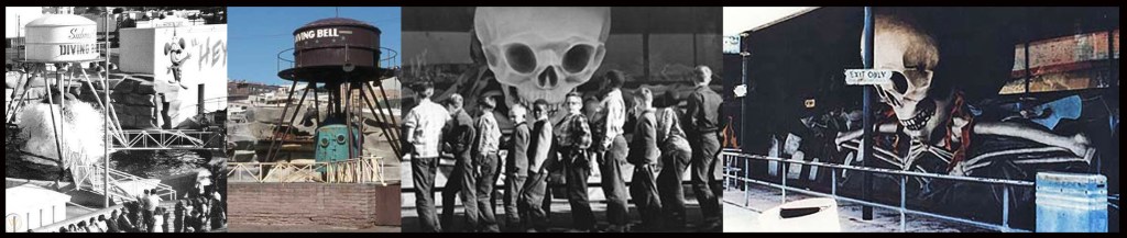 Eventually we left the Fun House and back out on the fairground there were plenty of conventional rides like a merry-go-round, dodge-em cars and a big ferris wheel.  Apparently there had once been a big roller coaster but it wasn’t there anymore in 1954.  One of my favourite rides was the ghost train.  A huge sculpture of a giant white skull with its two bony hands coming together sat behind a railroad track with a row of cars between two sets of double doors, one for the entrance and the other for the exit.  You’d give the unfriendly man one of your tickets, sit down in the car and he would push a bar over your lap. Then the car would begin moving, jerkily, towards the double doors, adorned with a spooky colour painting of a ghost across both sides.  Bang!  The car would violently push the two doors open, then jerk around to the right into what was now total darkness.  A sharp corner would be turned to the left then the right and the first of many scary images with equally scary noises would illuminate in the pitch blackness to confront your disoriented senses.  It was genuinely frightening and I loved this ride.
