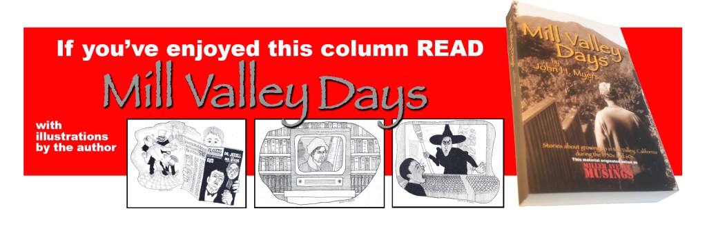 The cultural life of Mill Valley in the 1950s and 60s was enriched by these amateur dramatic productions, be it my sister Nell’s staging of events in ancient Rome or the Mill Valley Light Opera Company’s production of Iolanthe in Mead Theatre.  They brought the community together.  Nancy Strawbridge organised ticket sales, Mitch Howie’s mother Bettie helped with publicity and played flute in the orchestra.  Everybody pitched in and the likes of Irene Pritzker and Hughes Call were the ones who organised it all.  Perhaps a statue or two is in order?